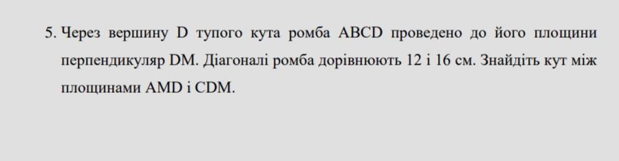 Оскільки АD∈АМD, DМ∈АМD та СD∈СDМ, DМ∈СDМ, то ∠АДС - це кут між площинами АМD i СDМ.