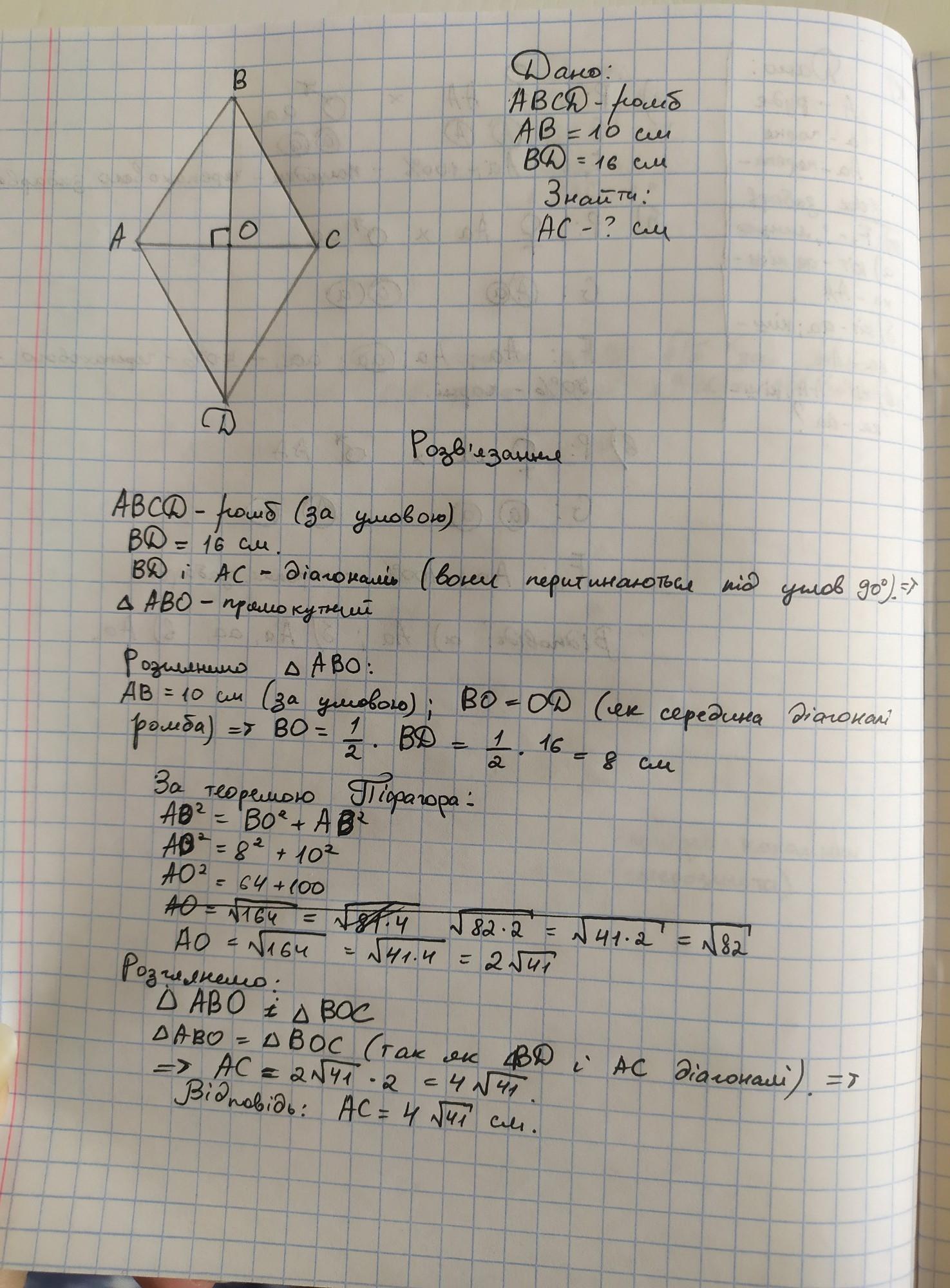 Сторона ромба дорівнює 10см, а одна з діагоналей — 16см. Знайдіть другу діагональ ромба.
