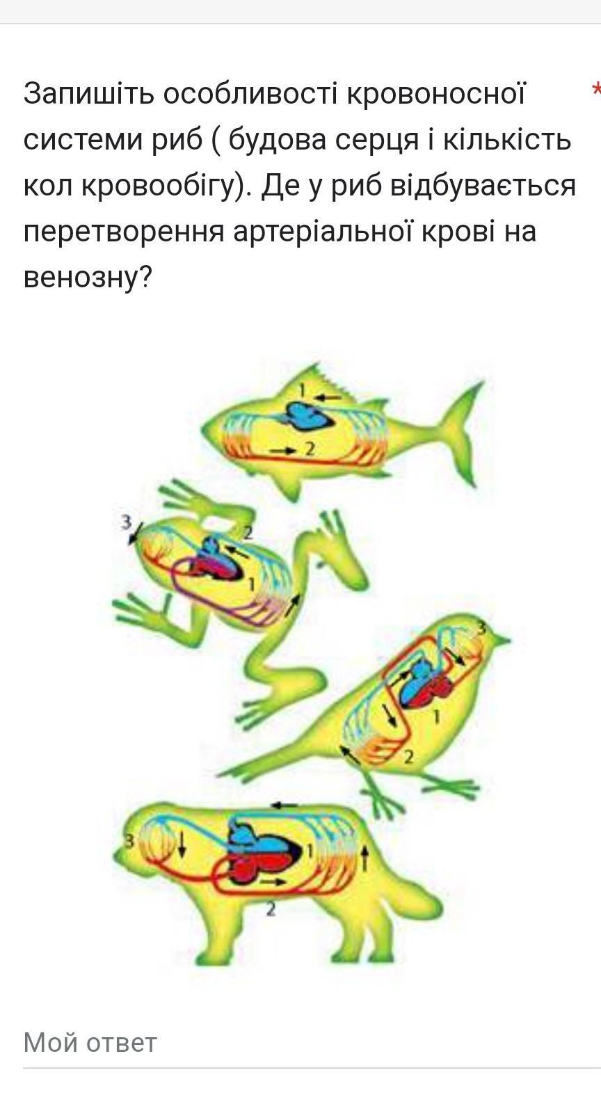 Через серце проходить венозна кров (містить вуглекислий газ). Кров насичується киснем і стає артеріальною в зябрах. У риб одне коло кровообігу: венозна кров від шлуночка серця через черевну аорту по вхідним зябровим артеріям надходить у зябра, де кров стає артеріальною (віддає вуглекислий газ і збагачується киснем)