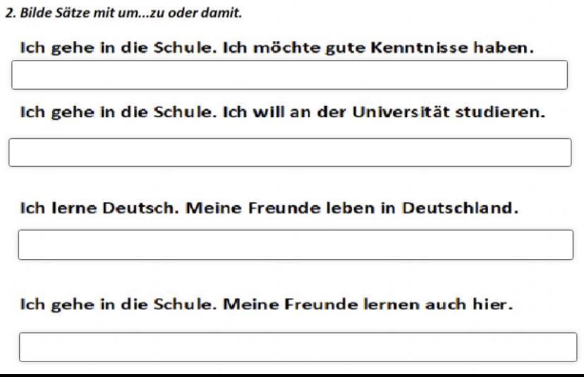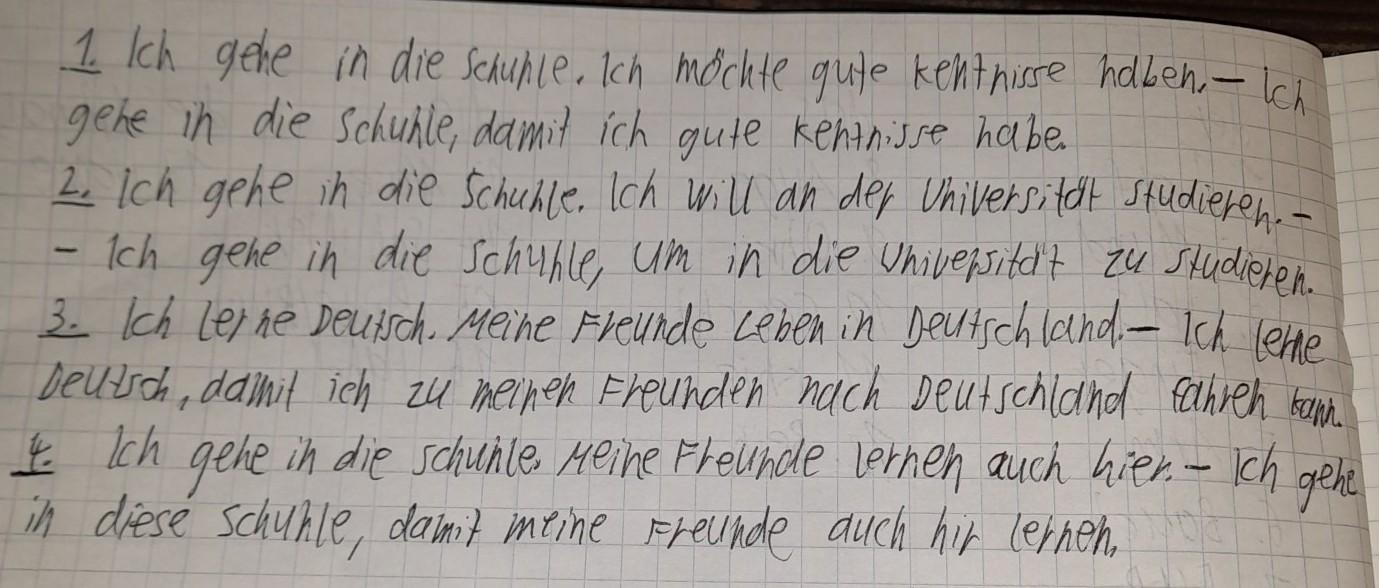1. Ich gehe in die Schuhle, damit ich gute kentnisse habe.