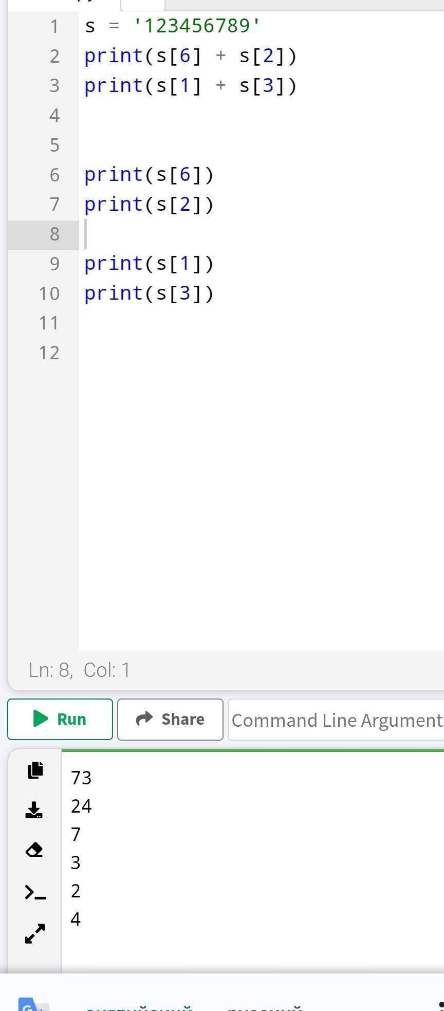 Какой результат будет выведен на экран, при выполнении третьей строки?
