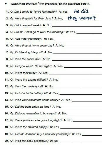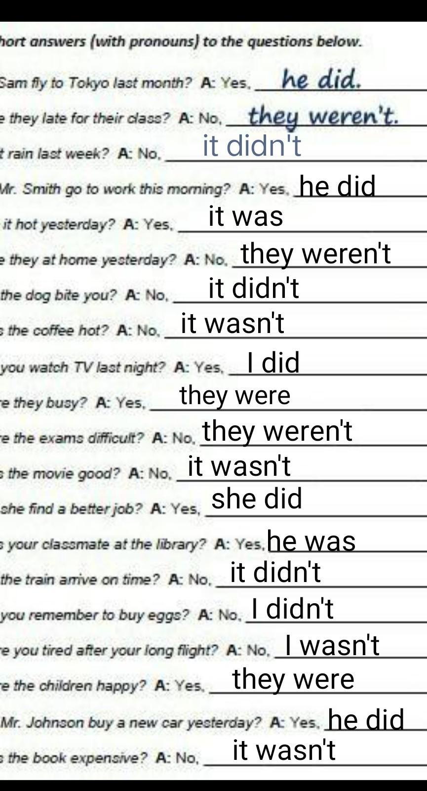 Write short answers (with pronouns) to the questions below. . Q: Did Sam fly to Tokyo last month? A: Yes.. he did. -Q: Were they late for their class? A: No. they weren't. Q: Did it rain last week? A: No. Q: Did Mr. Smith go to work this morning? A: Yes.. Q: Was it hot yesterday? A: Yes. Q: Were they at home yesterday? A: No. Q: Did the dog bite you? A: No. . Q: Was the coffee hot? A: No, Q: Did you watch TV last night? A: Yes, Q: Were they busy? A: Yes, . Q: Were the exams difficult? A: No. . Q: Was the movie good? A: No. Q: Did she find a better job? A: Yes, Q: Was your classmate at the library? A: Yes.. Q: Did the train arrive on time? A: No. Q: Did you remember to buy eggs? A: No. Q: Were you tired after your long flight? A: No. Q: Were the children happy? A: Yes. Q: Did Mr. Johnson buy a new car yesterday? A: Yes. Q: Was the book expensive? A: No, помогите