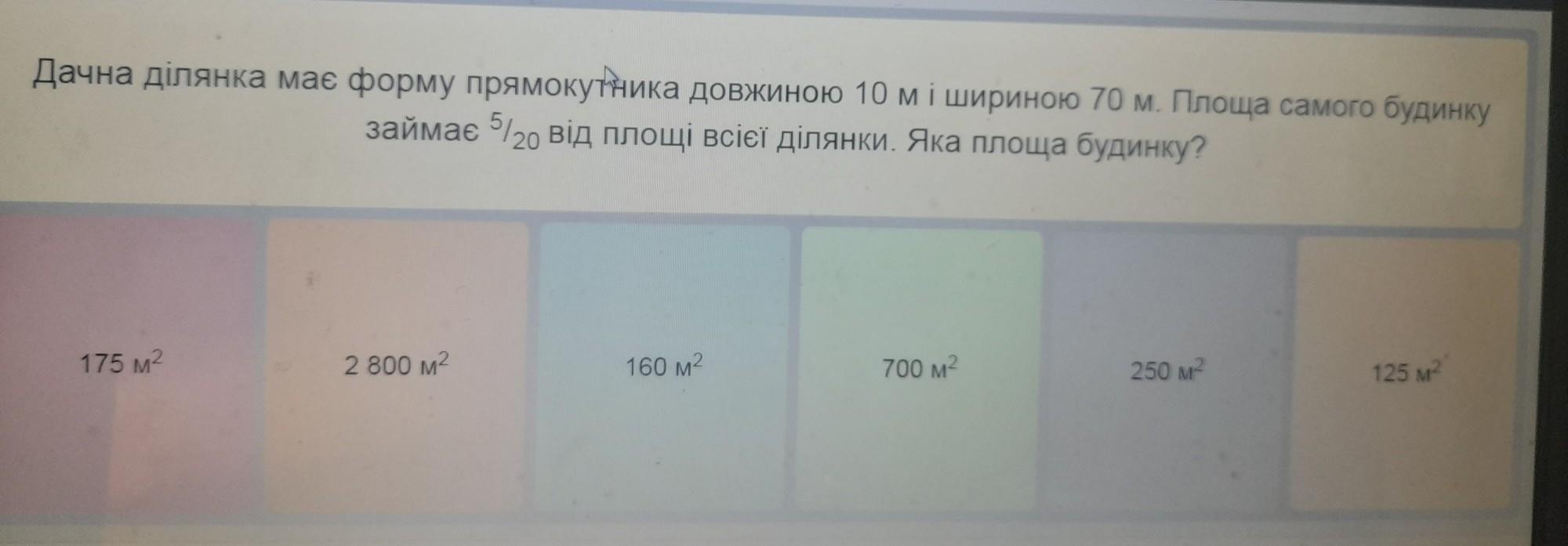 дачна ділянка має форму прямокутника довжиною 10 м і шириною 70 м. Площа самого будинку займає 5/20 від площі всієї ділянки. Яка площа будинку?
