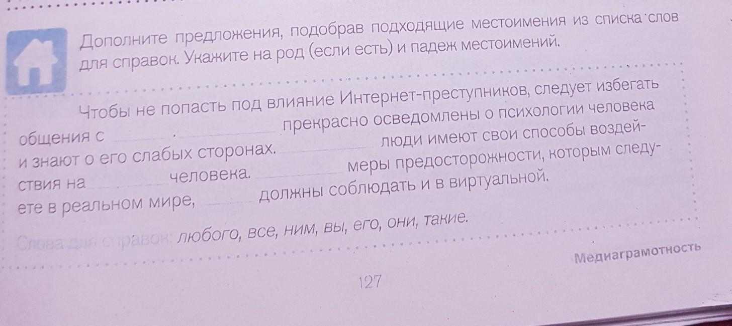 Дополните предложения, подобрав подходящие местоимения из списка слов для справок. Укажите на род (если есть) и падеж местоимений.