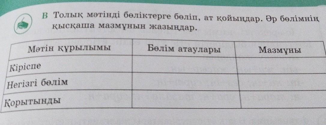 В Толық мәтінді бөліктерге бөліп, ат қойындар. Әр бөлімнің қысқаша мазмұнын жазыңдар. Мәтін құрылымы Кіріспе Негізгі бөлім Қорытынды Бөлім атаулары Мазмұны