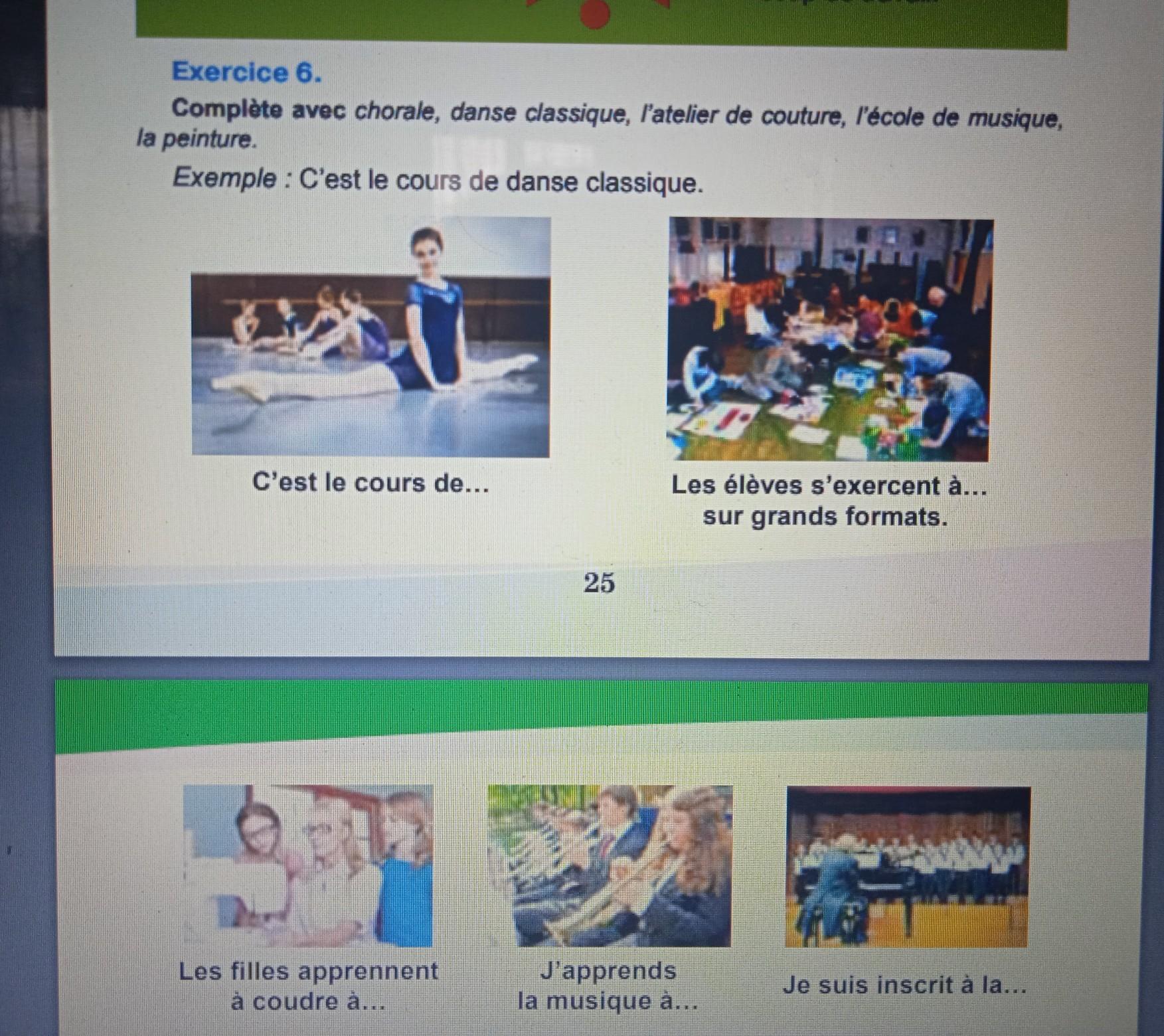 Exercice 6. Complète avec chorale, danse classique, l'atelier de couture, l'école de musique, la peinture. Exemple : C'est le cours de danse classique. C'est le cours de... FA LE Les filles apprennent à coudre à... 25 Les élèves s'exercent à... sur grands formats. J'apprends la musique à... Je suis inscrit à la...
