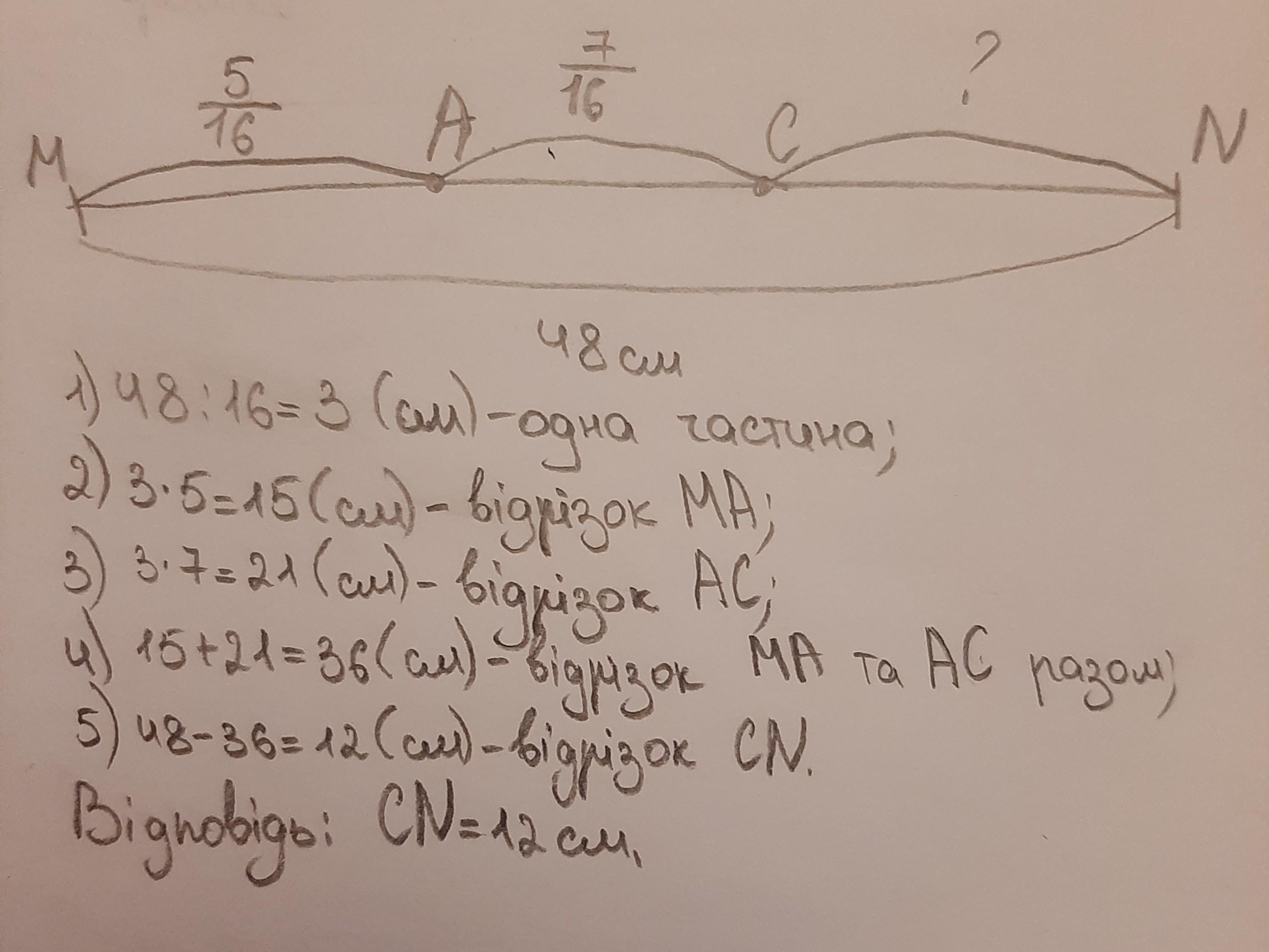Відрізок MN завдовжки 48см точками A і C поділено на частини. Відрізок MA становить 5/16 відрізка MN, відрізок AC-7/16 відрізка MN. Яка довжина відрізка CN?