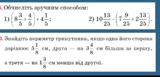 знайдіть периметр трикутника, якщо одна сторона його дорівнює 5 1/8 см друга на 3 4/8 см більша за першу а третя на 1 3/8 см менша від другої.