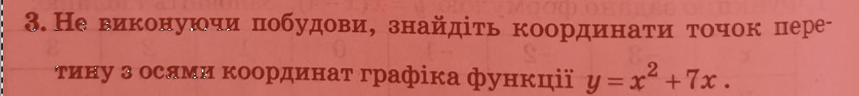 не виконуючи побудови, знайдіть координати точок перетину з осями координат графіка функції y=xˆ2 +7x