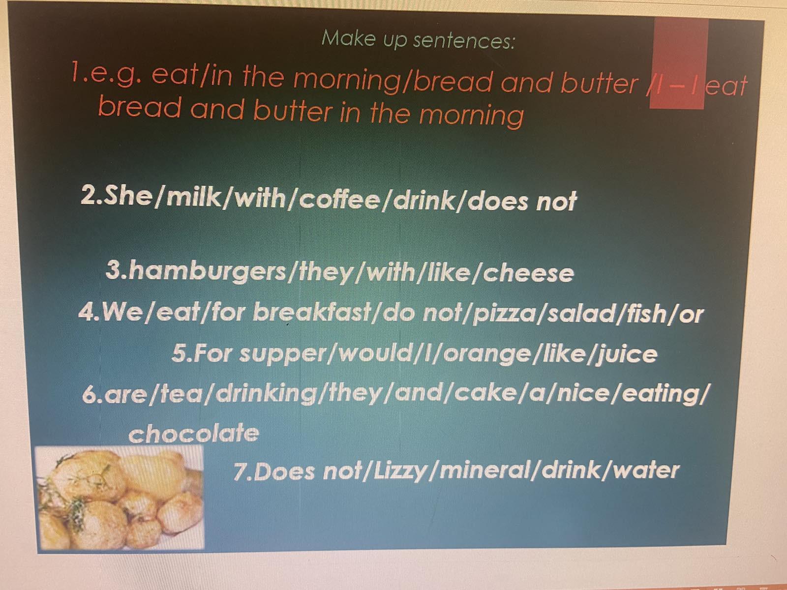 Make up sentences: 1.e.g. eat/in the morning/bread and butter /I-leat bread and butter in the morning 2.She/milk/with/coffee/drink/does not 3.hamburgers/they/with/like/cheese 4.We/eat/for breakfast/do not/pizza/salad/fish/or 5.For supper/would/l/orange/like/juice 6.are/tea/drinking/they/and/cake/a/nice/eating/ chocolate 7.Does not/Lizzy/mineral/drink/water