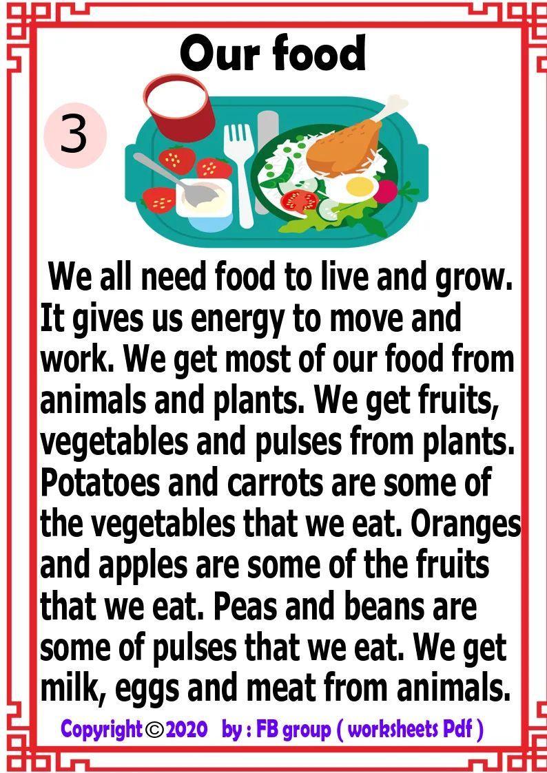Картофель и морковь - это некоторые из овощей, которые мы едим. Апельсины и яблоки являются одними из фруктов, которые мы едим. Горох и фасоль - это некоторые из бобовых, которые мы едим. Мы получаем молоко, яйца и мясо от животных.