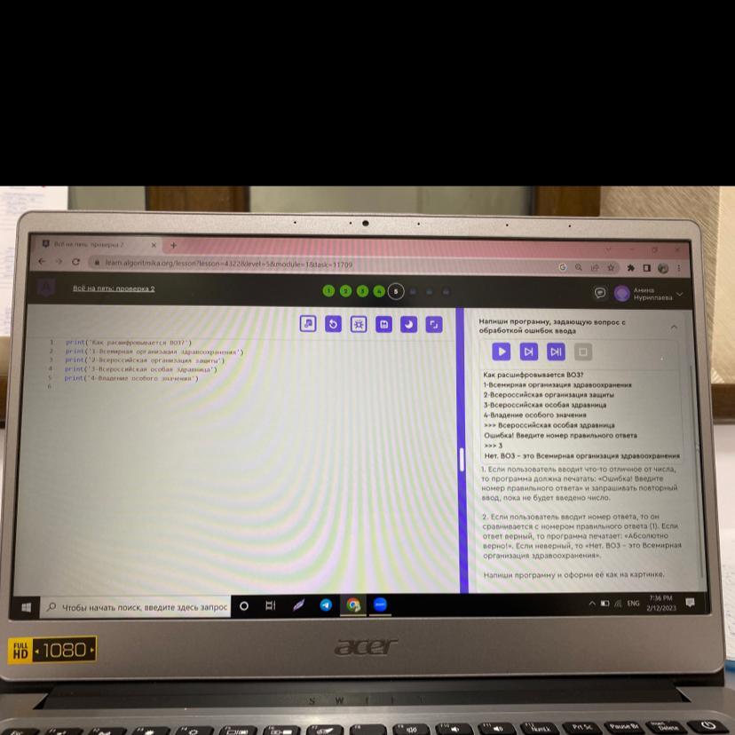 После того как вводишь буквы вместо того чтобы просто вывести : «ошибка, введите номер правильного ответа», после он добавляет надпись: нет. воз-всемирная организация здравоохранения.
