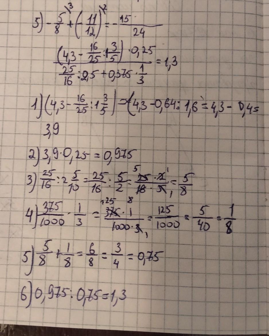 7) 0,975 : 3/4 = 0,975 : 0,75 = 1,3 или 1 3/10