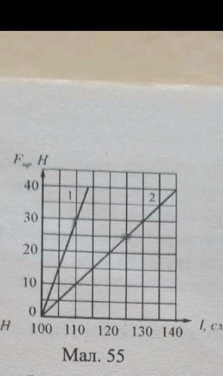 На графіку (мал. 55) зображено залежності сили пружності пружин від їх довжин. Жорсткість якої пружини бiльша? У скільки разів?
