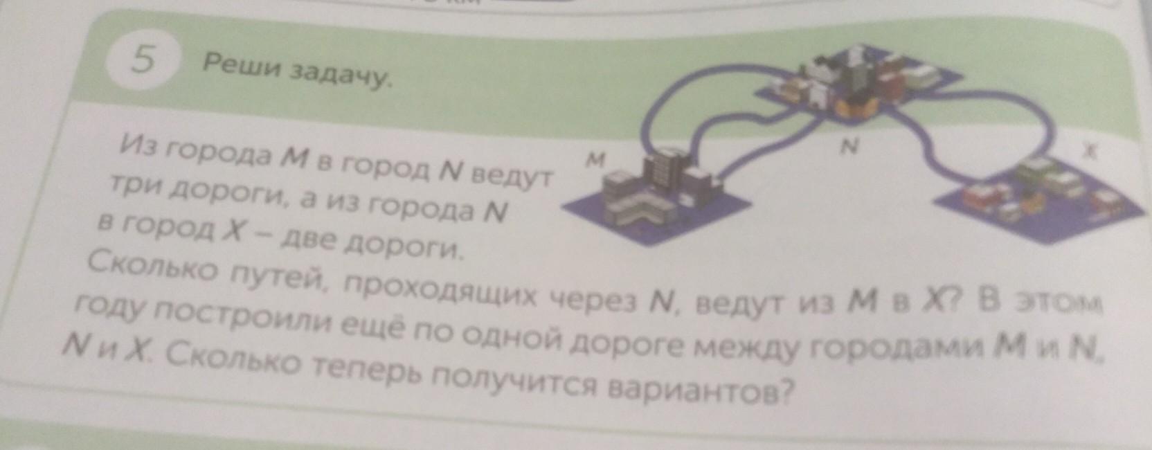 из города М в город N ведут 3 дороги, а из города N в Город Х две дороги. сколько путей, проходящих через N, ведут из М а Х? В этом году построили ещё по одной дороге между городами М и N, N и Х. Сколько теперь получится вариантов?