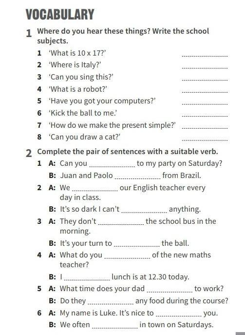 VOCABULARY 1 Where do you hear these things? Write the school subjects. 1 'What is 10 x 17?' 2 'Where is Italy?' 3 'Can you sing this?' 'What is a robot?' 4 5 6 'Kick the ball to me.' 7 'How do we make the present simple?' 8 'Can you draw a cat?' 'Have you got your computers?'