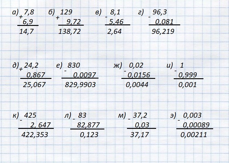 Выполните действие: а) 7,8 + 6,9, д) 24,2 + 0,867; и) 1 - 0,999; б) 129 + 9,72; е) 830 - 0,0097; к) 425 - 2,647; в) 8,1 - 5,46; ж) 0,02 - 0,0156, л) 83 - 82,877; г) 96,3 - 0,081; э) 0,003 - 0,00089; м) 37,2 - 0,03"