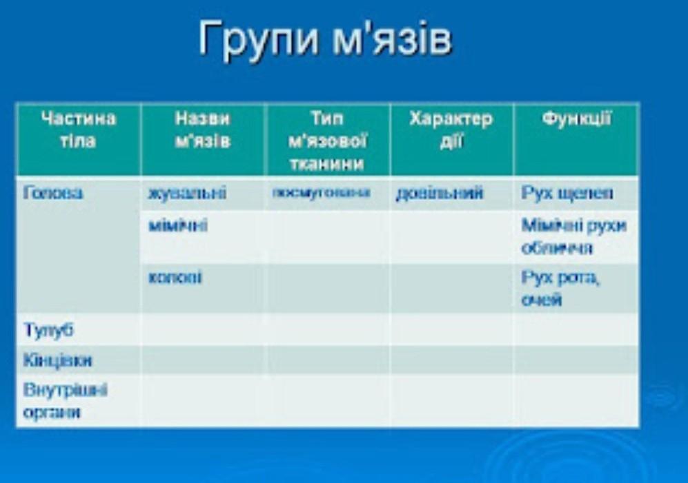 Завдання з Біології 8 клас М'язи , Группи М'язів табличка , будь ласка завдання до завтра!!!