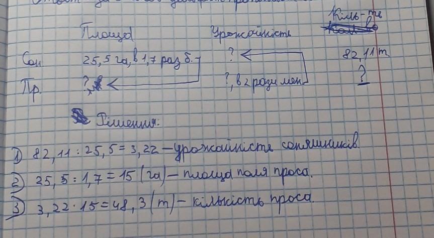 у фермерському господарстві посіяк на площі 25,5 га, яка в 1,7 раз більша, ніж площа, засіяна просом. Урожайність проса виявилася вдвічі меншою, ніж урожай- нiсть соняшника. Скільки зібрали проса, якщо соняшника зібрали 82,11 т?