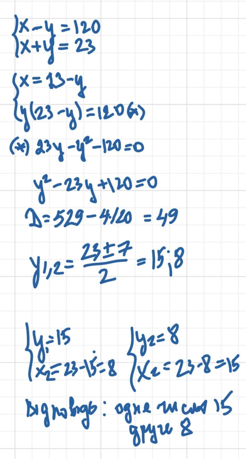 1. Добуток двох чисел = 120, їх сума = 23. Знайдіть ці числа. 2. Периметр прямокутника = 42 см. Його площа = 108 см². Знайти діагональ прямокутника.