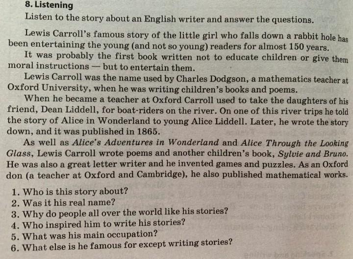 1. This story is about an English writer, his writer name was Lewis Carroll.