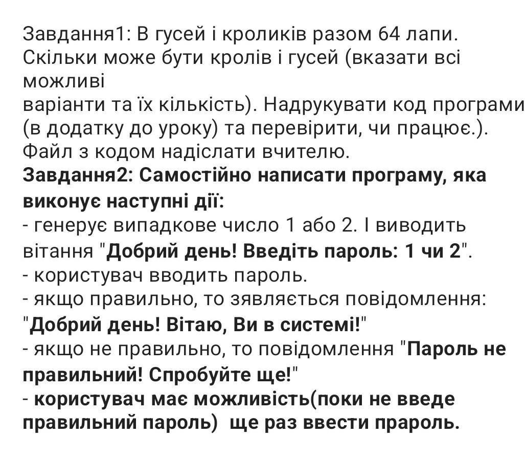Для завдання 1 ви можете написати наступний код на Python, щоб знайти всі можливі комбінації кроликів і гусей, які мають у сумі 64 лапи: