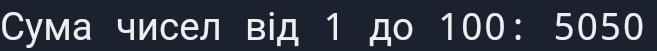 Python: на екран виводяться наступні числа від 1 до 100: 1, 2, 3, 4, ... 100. В циклі обчислюється сума чисел від 1 до 100, тобто сума 1 + 2 + 3 + ... + 100. Після завершення циклу виводиться на екран обчислена сума чисел - кінцевий результат.