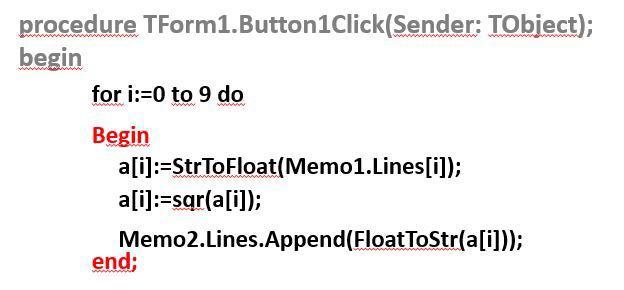 У результаті виконання цього фрагмента програми процедура обчислить квадрат 10 значень із плаваючою крапкою, перетворить результат у рядок і додасть кожен результат у властивість "Memo2.Lines".
