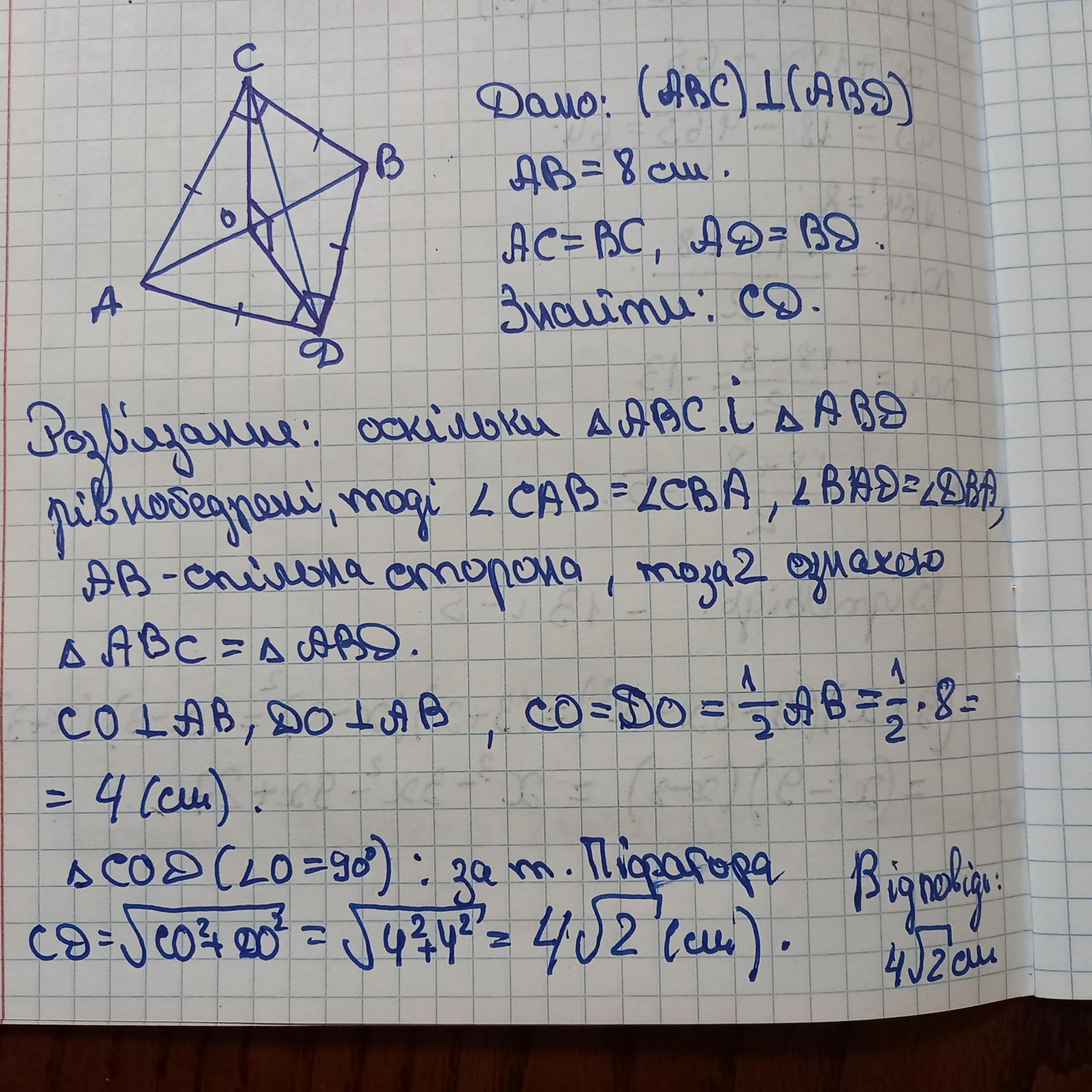 два прямокутних рівнобедрених трикутники мають спільну гіпотенузу, яка дорівнює 8 см. площини цих трикутників перпендикулярні. знайдіть відстань між вершинами їх прямих кутів