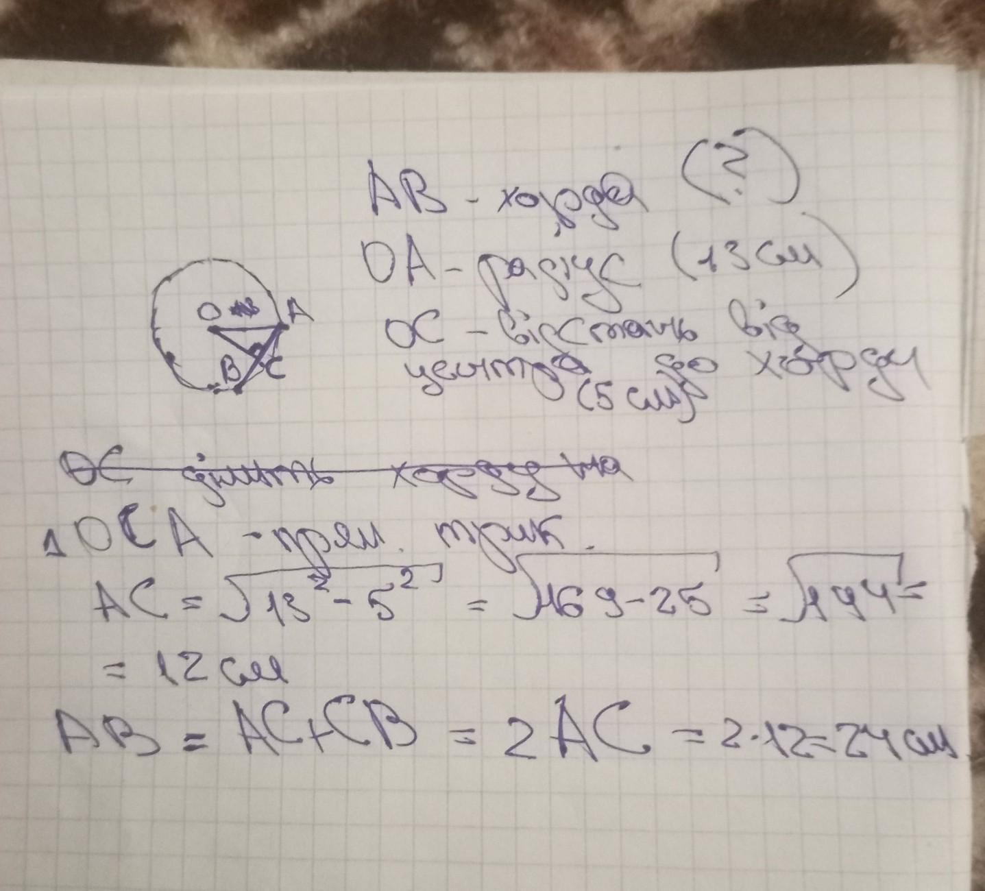 СРОЧНО!!!6. У колі радіуса 13 см проведено хорду. Знайдіть довжину хорди, якщо вона віддалена від центра кола на відстань 5 см.