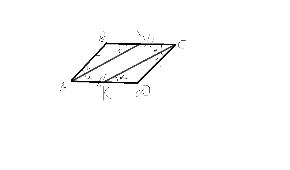 Рассмотрим свойства параллелограмма: противоположные углы равны и так же противоположные стороны тоже равны и параллельны между собой. Это значит что угол МАД= углу АМВ аналогично уголКСВ=углуДКС значит АМ||CK