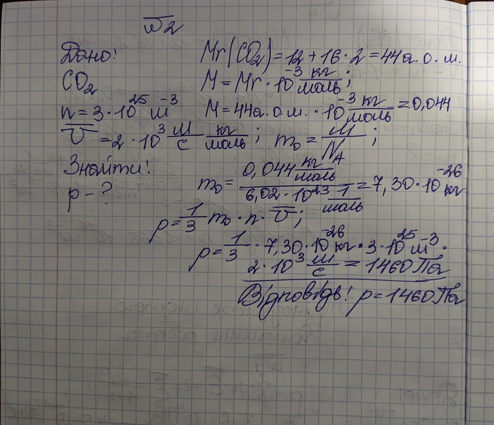 Визначте тиск молекул вуглекислого газу якщо середня квадратична швидкість молекул 2 на 10 в 3 степені м/с, концентрація молекул 3 на 10 в 25 степені 1/м3?