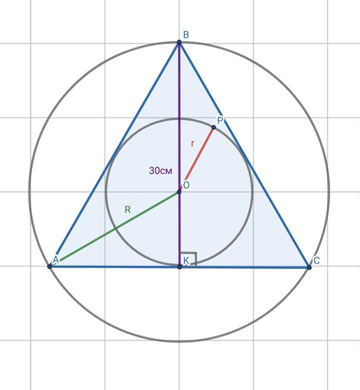 Висота рівностороннього трикутника дорівнює 30см. Знайдіть радіус вписаного і описаного кіл.