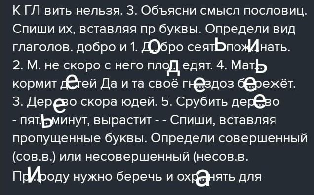 K ГЛ вить нельзя. 3. Объясни смысл пословиц. Спиши их, вставляя пр буквы. Определи вид глаголов. добро и 1. Д...бро сеят... пож...нать. 2. М. не скоро с него пло... едят. 4. Мат... кормит д...тей Да и та своё гн...здоз б...режёт. 3. Дер...во скора юдей. 5. Срубить дер...во - пят... минут, вырастит - - Спиши, вставляя пропущенные буквы. Определи совершенный (сов.в.) или несовершенный (несов.в. Пр...роду нужно беречь и охр...нять для