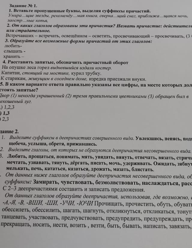 1 Умирающие (а и ющ) звёзды, рекомендуемая (ем и ая) книга, сверкающий (ющ) снег, приближающаяся (а и ющ) ночь, заострённые (енн) копья. [Не поняла второе задание, какие причастия? Из первого задания?]2 Умирающие - умирать (действительное)Рекомендуемая - рекомендовать (страдательная)Сверкающий - сверкать (действительное)Приближающаяся - приближаться (действительное)Заострённые - заострять (страдательное)Или так:Встречавших - действительное Освещённом - страдательное Просвечивающий - действительное 3 Любить - любящий, любивший, любимый, любленныйСлышать - слушающий, слушавший, слушаемый Хранить - хранящийся, хранимый 4 [Тут уже все знаки правильно расставлены]На опушке леса горел |~видневшийся издали~| костёр Капитан, |~стоящий на мостике~|, курил трубку К старикам, |~живущим в соседнем доме~|, изредка приезжали внуки. 5 - 1,3 [Правильный ответ выделен]