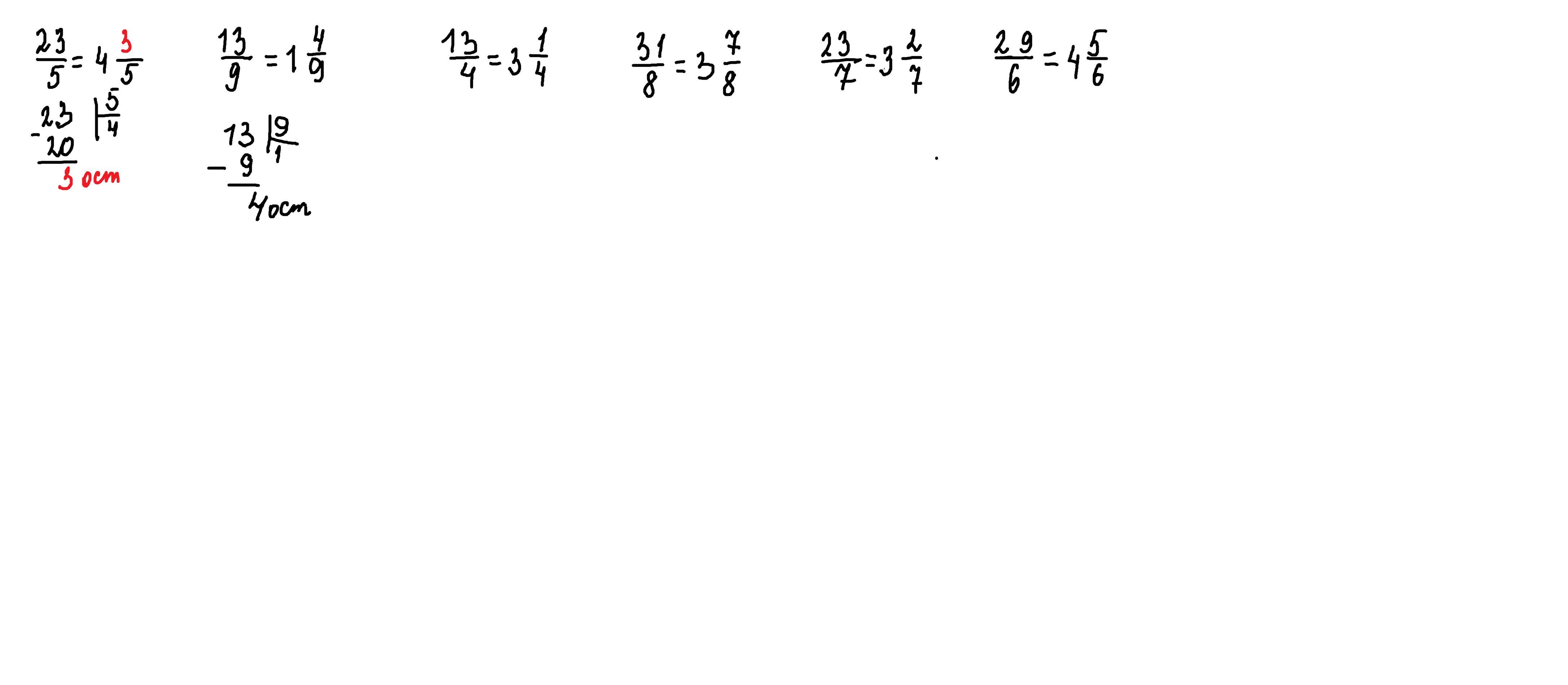 запишіть неправильний дріб як мішане число: 1) 23/5; 2) 13/9; 3) 13/4; 4) 31/8; 5) 23/7; 6) 29/6.