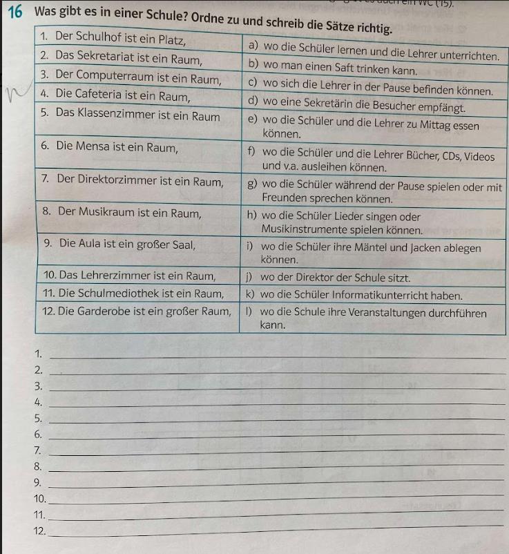 10. Das Lehrerzimmer ist ein Raum, wo sich die Lehrer in der Pause befinden können.