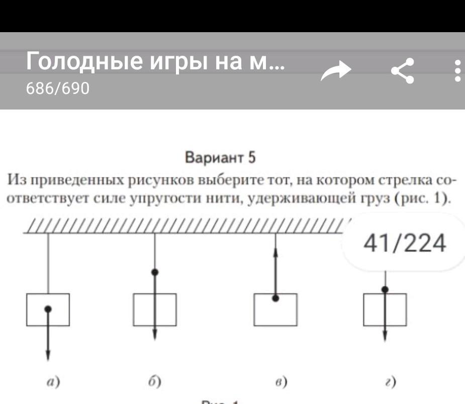 686/690 Вариант 5 1. Из приведенных рисунков выберите тот, на котором стрелка со- ответствует силе упругости нити, удерживающей груз (рис. 1). дам 20 баллов