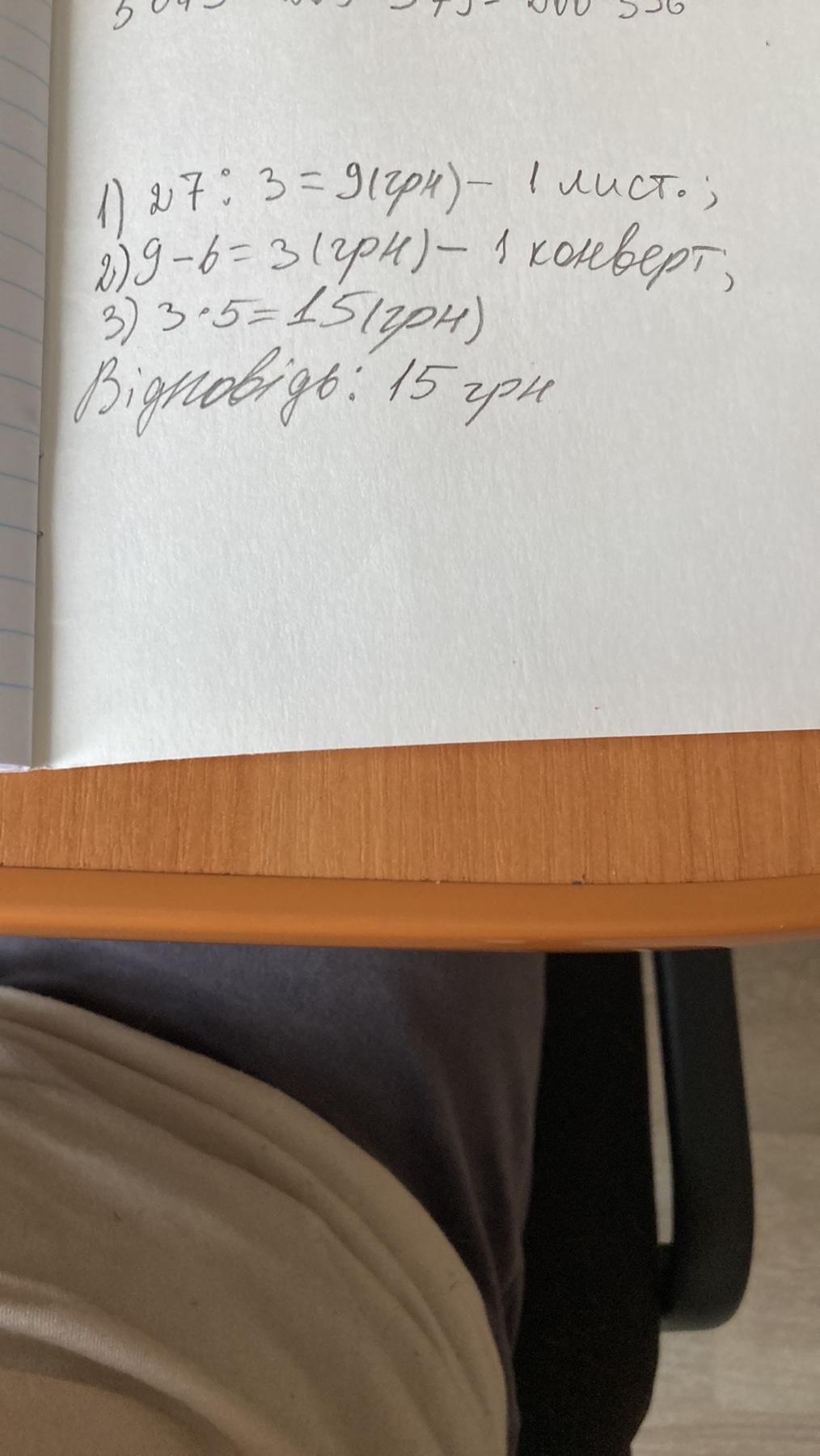 За 3 листівкиТарас заплатив 27 грн. СКІЛЬКИ ТРЕБА ЗАПЛАТИТИ ЗА 5 КОНВЕРТІВ,ЯКЩО ЦІНА КОНВЕРТА НА 6 ГРН МЕНЬША?