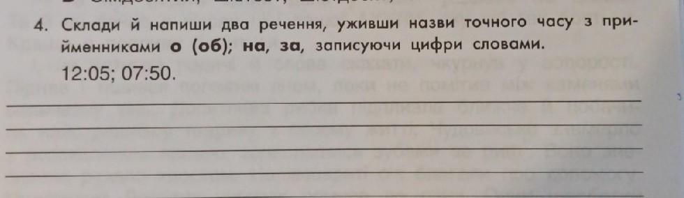 Склади й напиши два речення уживши назви точного часу з прийменниками о (об); на, за, записуючи цифри словами