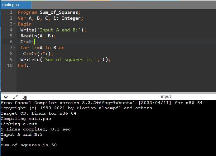 Программа должна вывести одно число - сумму квадратов всех целых чисел от А до В вклю-чительно. Паскаль