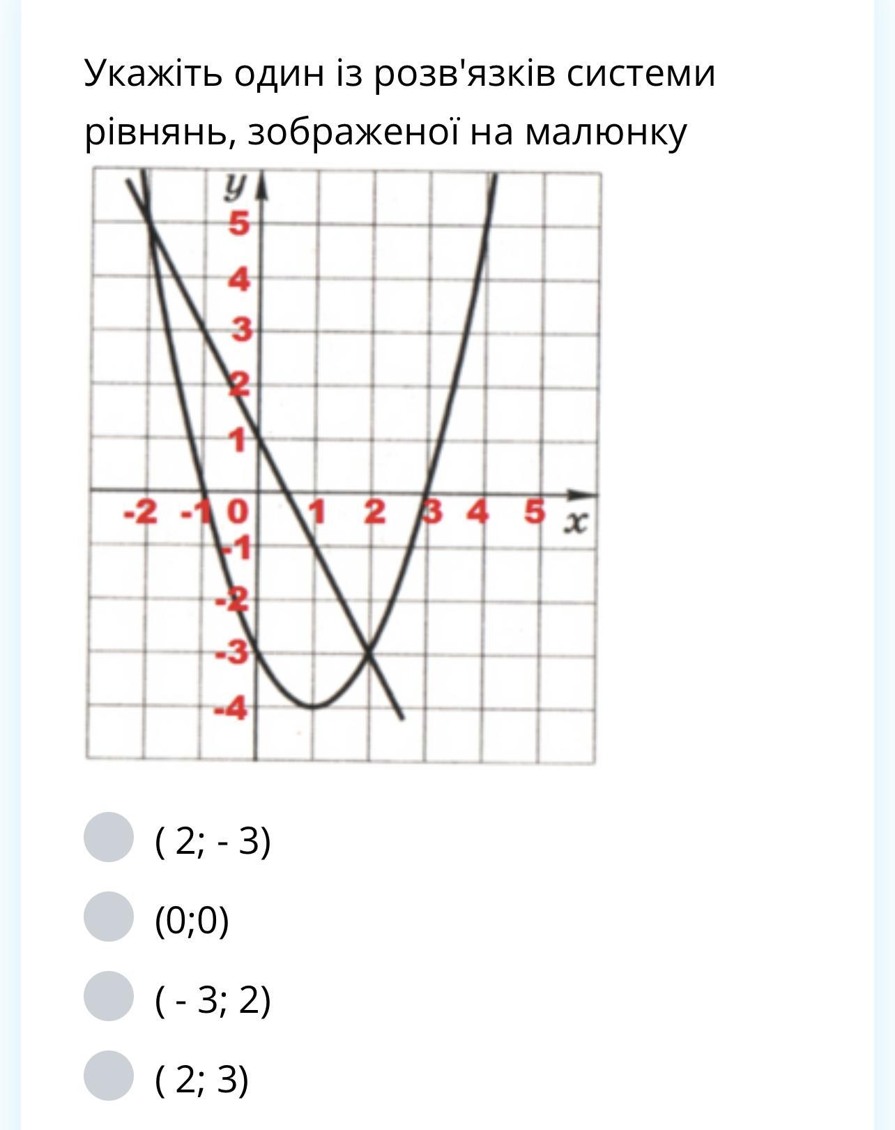 Решением системы является точка пересечения двух графиков. Смотрим, что у нас есть две точки — это (-2; 5) и (2; -3). В вариантах ответа есть лишь один подходящий нам вариант, это (2; -3).