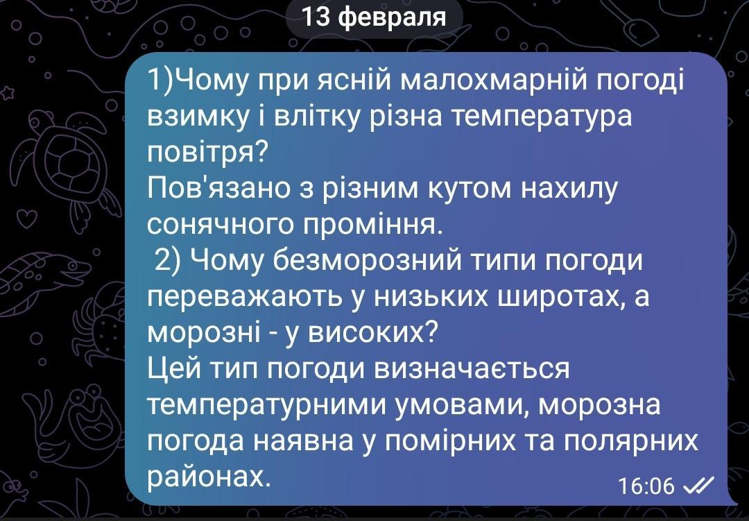 Дати письмову відповідь на питання: 1) Чому при ясній малохмарній погоді взимку і влітку різна температура повітря? 2) Чому безморозні типи погоди переважають у низьких широтах, а морозні - у високих?