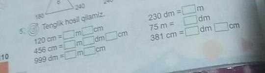 110 19 240 120 cm = 456 cm = 999 dm = 240- 180 Tenglik hosil qilamiz. mcm mdmcm mcm 230 dm = 75 m = 381 cm =[ m dm dm cm