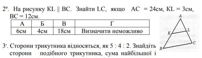 Завдання 2 . На рисунку КL || ВС. Знайти LC, якщо АС = 24см, КL = 3см, ВС = 12см. СРОЧНО!!!