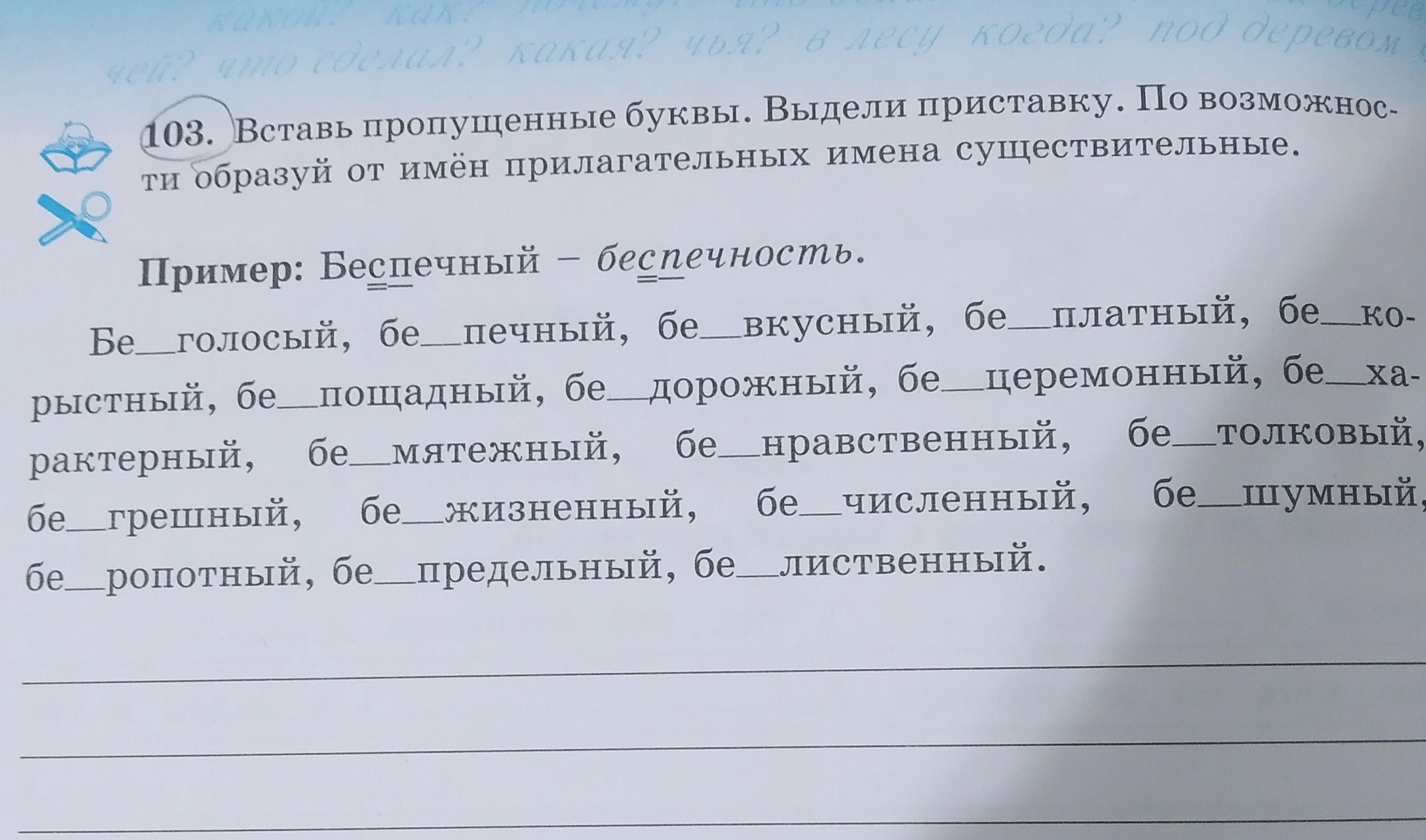 103. Вставь пропущенные буквы. Выдели приставку. По возможнос- ти образуй от имён прилагательных имена существительные. ПОМАГИТЕ ПОЖАЛУЙСТА