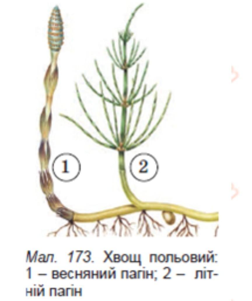 6.Спороносні пагони рожево-бурі, соковиті, нерозгалужені, членисті, листки розміщені кільцями, зростаються між собою, утворюючи потовщені піхви, що мають 8—10 чорно-бурих зубців.