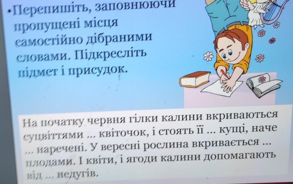 •Перепишіть, заповнюючи пропущені місця самостійно дібраними словами. Підкресліть підмет і присудок. На початку червня гілки калини вкриваються суцвіттями ... квіточок, і стоять її ... кущі, наче наречені. У вересні рослина вкривається ... плодами. І квіти, і ягоди калини допомагають від ... недугів. ...