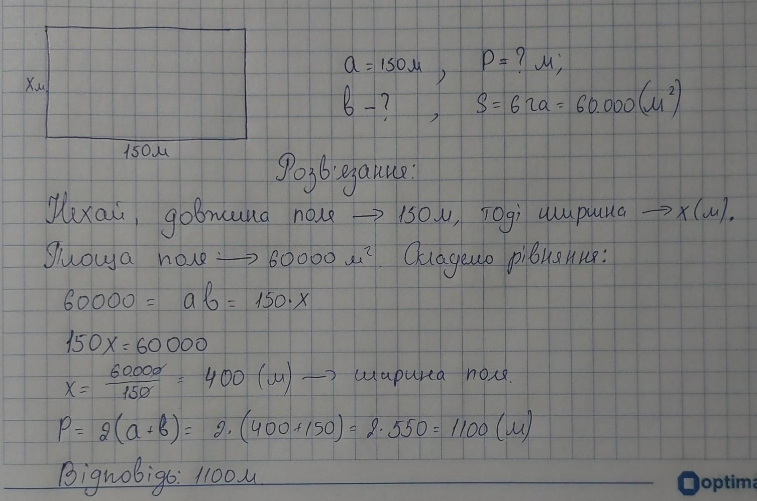 Поле прямокутної форми має площу 6 га, його ширина дорівнює 150 м.
