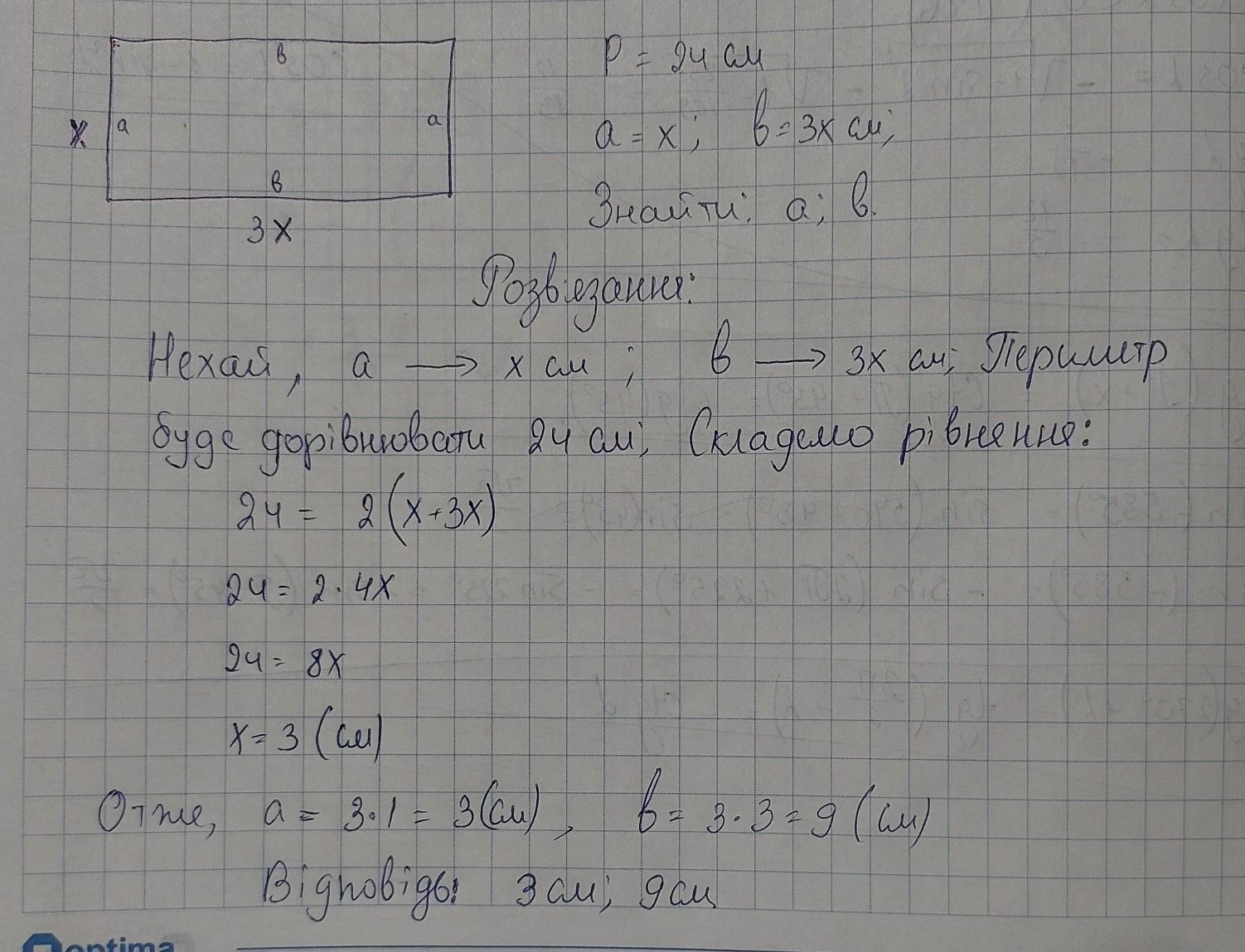 Задачі такого типу "перша сторона більша другої у два рази" і т.д. розв'язуємо саме таким способом, як показано на фото.